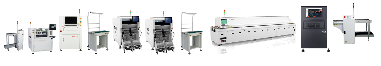 全自動(dòng)上板機(jī)→ 全自動(dòng)印刷機(jī)GKG  GSE→思泰克SPI →接駁臺(tái) →RX-7→ RX-7→ 接駁臺(tái)→ 勁拓回流焊→ 矩子在線AOI → 下板機(jī)(從左→ 右)